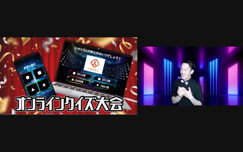 対面・オンラインどちらでも実施可能。お手元のスマホを使って簡単にクイズ大会やビンゴ大会、抽選会を楽しめます。IKUSAのプロのMCが盛り上げ、貴社ならではの設問やテレビ番組風の演出も可能です。