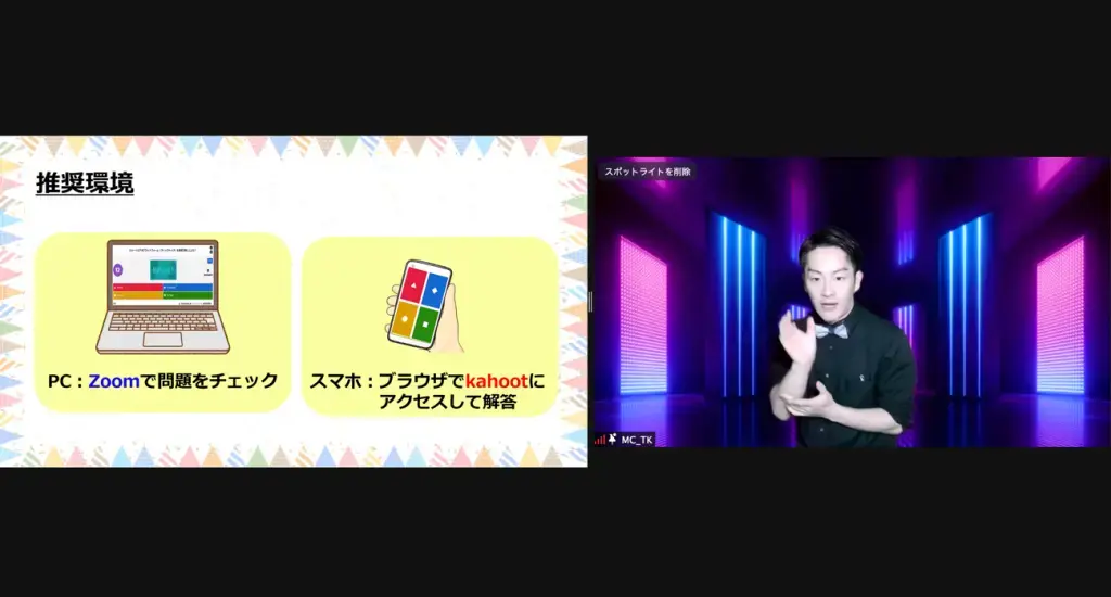 参加者はZoomなどのビデオチャットツール上に出題されるクイズに、自身のスマートフォンから回答を送信します。