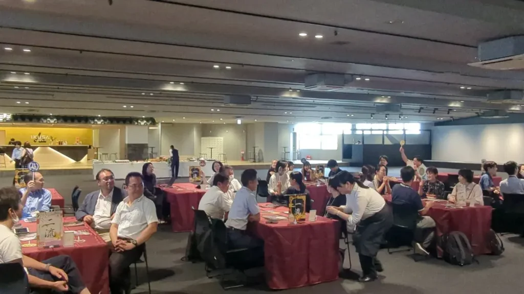 格付けバトルは、テレビ番組気分を全員で楽しめる、体感型クイズゲームです。味わう、見るなど五感を駆使して「一流の品」を見極め、全問正解の「一流ゲスト」を目指していただきます。参加者様はフリップを上げて回答したり、間違えて二流や三流に降格してしまったり、テレビ番組のゲストになった気分を味わいながら楽しめます。テーブル対抗戦でユニークなチームビルディングとしても、個人戦でカジュアルなレクリエーションとしても活用いただけます。