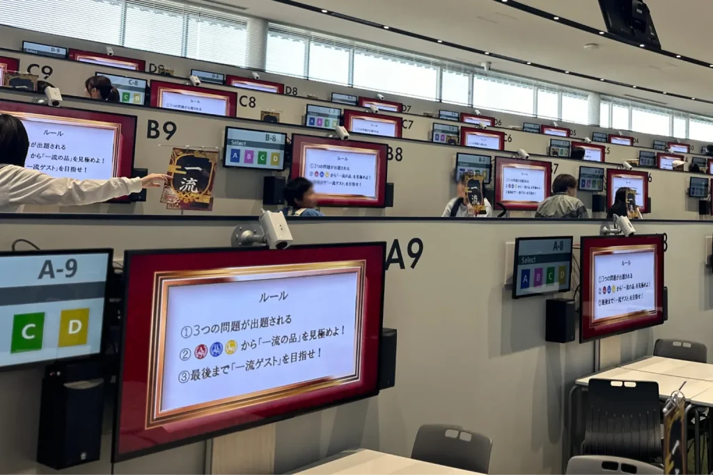 参加者の皆様は、各テーブルでモニターを見ながら、「俳句」「バイオリン」「ブレイクダンス」の一流を見極める格付けゲームにチャレンジ!最新技術を取り入れた設備をフル活用し、回答はタッチパネルで選択、正解者にはインタビューを行いその様子をメインモニターで映すなど、バラエティ番組のような演出で楽しんでいただきました。