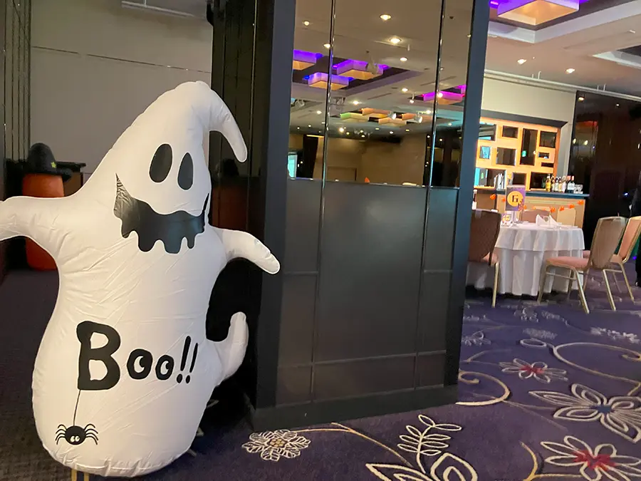 会場に入場するとハロウィン感満載のお化けやジャックオランタンの装飾がお出迎えです。受付では仮装をお持ちでない方向けに仮装衣装の配布し、今まで交流のなかった社員同士の交流を深めるためにくじを引いて席順を決めました。