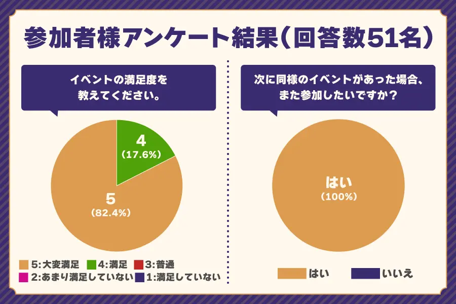 「同様にイベントがあった場合参加したいですか?」という質問には、なんと 100%の方が“はい”とご回答いただき、満足度が高いイベントになりました。
