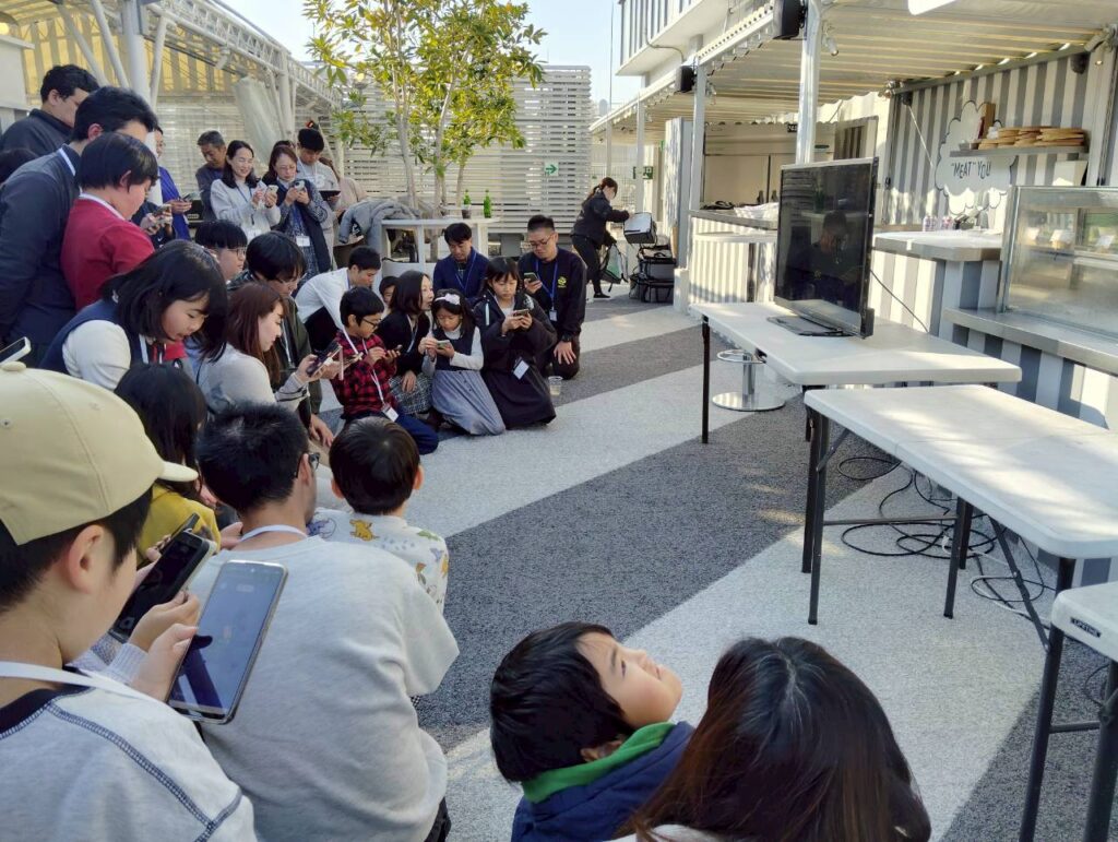 クイズはスマートフォンを使って参加する形式で、モニター前には自然と人が集まり、特に子どもたちは最前列に座って意欲的に楽しんでいました。